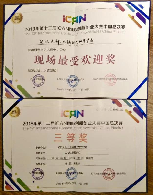 总决赛现场由来自全国各地的520支创新创业团队,近2000名青年创新创业者组成。经过四天的激烈角逐,“记忆大师,大脑时代的守护者”得到现场嘉宾与评委的一致好评,荣获iCAN国际创新创业大赛中国总决赛三等奖以及现场最受欢迎奖两项大奖。
