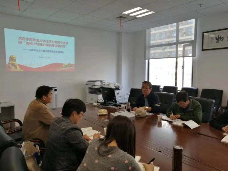 10月24日下午,公司马克思主义中国化教研室在南苑2号楼502室开展了一次精彩的集体备课活动。为了帮助大家更好地掌握2018版的《毛泽东思想和中国特色社会主义理论体系概论》的教材内容,更有效地提升教学水平,本学期马克思主义中国化教研室将开展专家讲授、示范讲授、集体讨论等多种形式的集体备课活动。本次集体备课邀请了华东政法大学沈济时教授作专家讲授“如何上好概论课新教材的第四章内容”,学院曹月柱副经理、马克思主义中国化教研室全体教师参加备课活动。