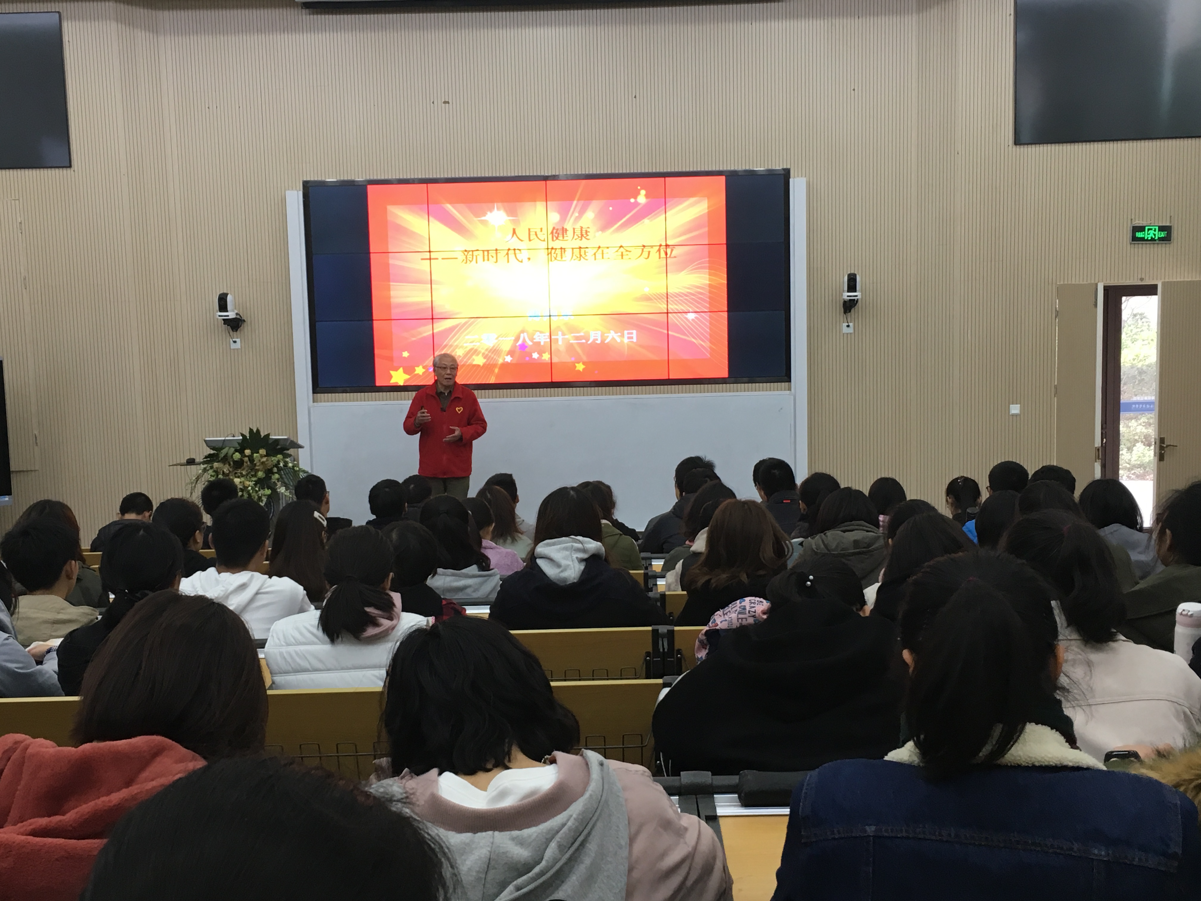 傅老师以“新时代,健康在全方位”为题,从新时代与人民健康、身心健康与志愿精神、我的理想与健康追求三个方面展开教学。