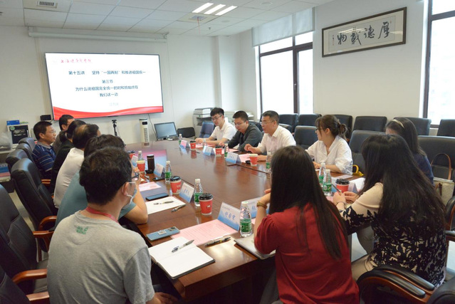 孙玉良经理在致辞中对邢云文教授一行的到来表示欢迎,对专家组“传经送宝”表示感谢。习近平新时代中国特色社会主义思想概论教研室主任罗会德教授介绍了公司“习概论”课的开设过程,并从课程设置、目标定位、组织实施、考核评价、教学资源库建设和教学团队建设六个方面汇报了课程建设情况。教研室江先锋副教授以“‘一国两制’的时、势、利”为题,进行了现场说课。舒国宋、张学娟、魏敏三位教师分别围绕教材问题、精讲与略讲问题、专题式教学问题等进行了深入讨论和交流。