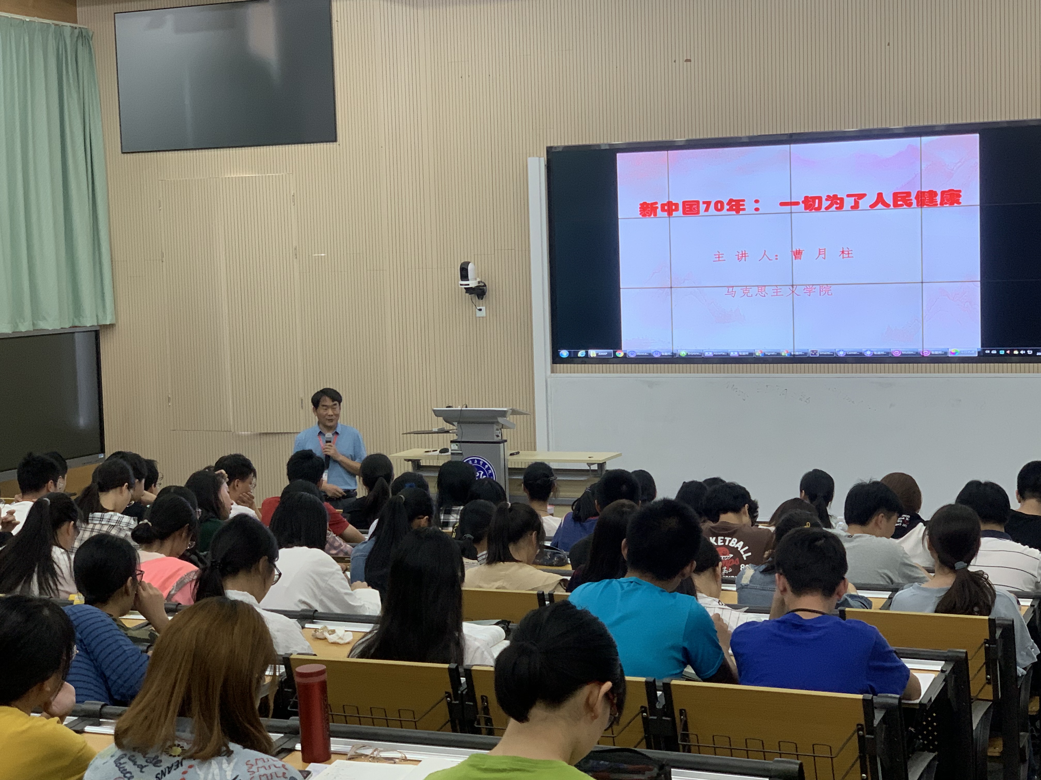 9月26日下午,在南苑w100沉浸式教室,betway西汉姆联曹月柱老师为19临床医学专业员工主讲了“新中国70年:一切为了人民健康”的专题教学。