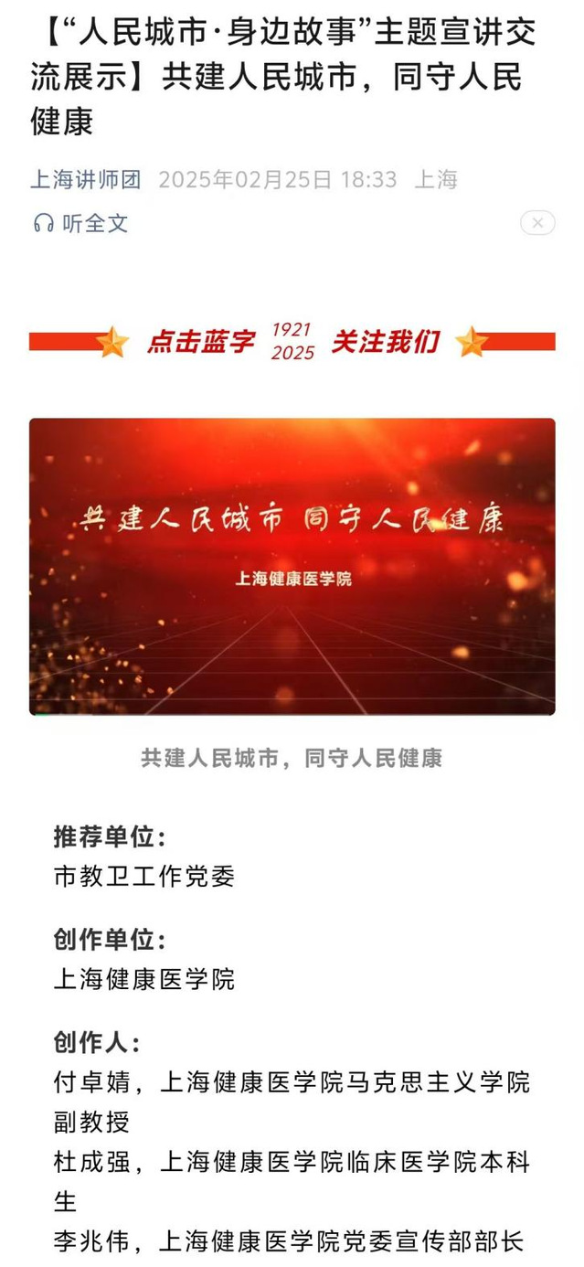 近日,为深入学习宣传贯彻习近平总书记给“老杨树宣讲汇”全体同志重要回信精神,推动各级宣讲团队进一步讲好人民城市理念及其上海实践,上海市组织开展了“人民城市·身边故事”主题宣讲交流展示活动。公司报送的作品“共建人民城市 同守人民健康”的微视频,在上述活动中展示,获得“上海讲师团”等媒体平台宣传推广。