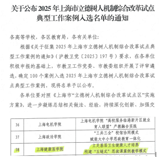 近日,中共上海市教育卫生工作委员会、上海市教育委员会公布了2025年上海市立德树人机制综合改革试点典型工作案例入选名单,由公司betway西汉姆联报送的《立足基层卫生健康人才培养 构建“五链式”思政课案例教学模式》案例成功入选。此次案例入选是学校落实立德树人根本任务,持续深化新时代思政课改革创新的一项重要成果,是betway西汉姆联推进以习近平新时代中国特色社会主义思想为核心内容的课程体系建设,努力打造“人民健康”2.0版思政大课实践探索的重要成果。