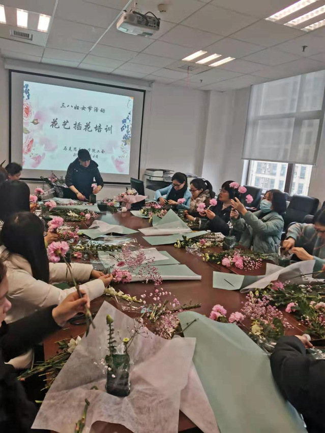 阳春三月春意浓,在第111个“三八”国际劳动妇女节即将来临之际,为丰富马院女教师的业余文化生活,让老师们度过一个有意义的节日,马院工会于3月4日在南苑2号楼502组织开展“花艺插花培训”活动。此次活动得到了学院女教师的积极响应,全体女教师参加了插花活动。活动现场首先由花艺师为大家讲解现场鲜花种类、插花技巧及注意事项等,在花艺师的指导下,女教师们纷纷拿起手边的鲜花,根据自己的喜好、审美,搭配出不同层次的花束,并相互交流自己的创意搭配,兴趣盎然。活动在一片欢声笑语中圆满结束。