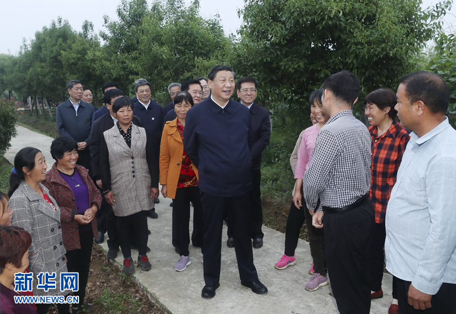 5月14日上午,中共中央总书记、国家主席、中央军委主席习近平在河南省南阳市主持召开推进南水北调后续工程高质量发展座谈会并发表重要讲话。这是座谈会前,习近平于13日在南阳市淅川县九重镇邹庄村考察时,同因工程建设搬迁到这里的村民们亲切交流。新华社记者 王晔 摄