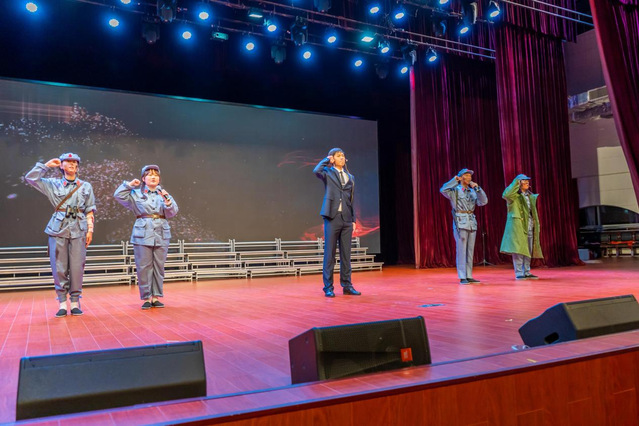 长征中的湘江战役是长征以来最惨烈的一仗。同学们以歌舞剧的形式,展现了血战湘江的场景。歌舞剧讲述了1934年红军34师官兵付出巨大牺牲奋力掩护党中央渡过湘江、成功突破封锁的悲壮故事。歌舞剧最后场景中,红旗升起、挥舞在空中,全体红军整齐划一地面向红旗行注目礼,点燃了观众们内心的热血,这一幕令师生们动容。