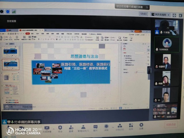 在开会之前,各位老师重新学习了课程教学大纲和实践教学大纲,对标中宣部、教育部颁布的《新时代学校思想政治理论课改革创新实施方案》,提出了教学大纲的修订意见。大家普遍认为,在2020版新教材使用后,有必要对教材每一章的教学重点和难点进行重新修订,以适应新的教学内容。与新教材匹配的实践教学大纲,应着力突出公司特色,以“医患共情”为主题,构建医路引领、医路修德、医路前行“三位一体”实践教学体系。在经过充分讨论之后,教研室主任付卓婧老师,根据学校专家指导意见,整合了说课程PPT,从课程目标、教学内容、教学改革设计、教学评价、教学资源五个方面向全体教师进行了汇报,并听取了大家的意见与建议。